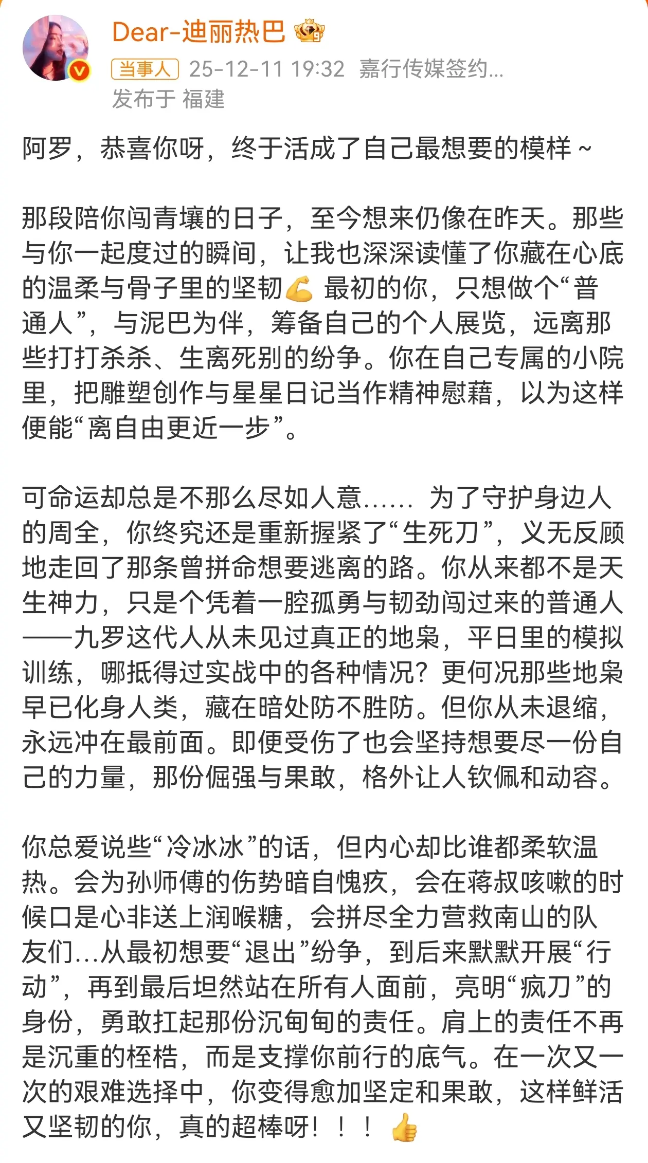 收官日迪丽热巴发超长文告白,提到聂九罗的坚强,勇敢,和柔软的内心。