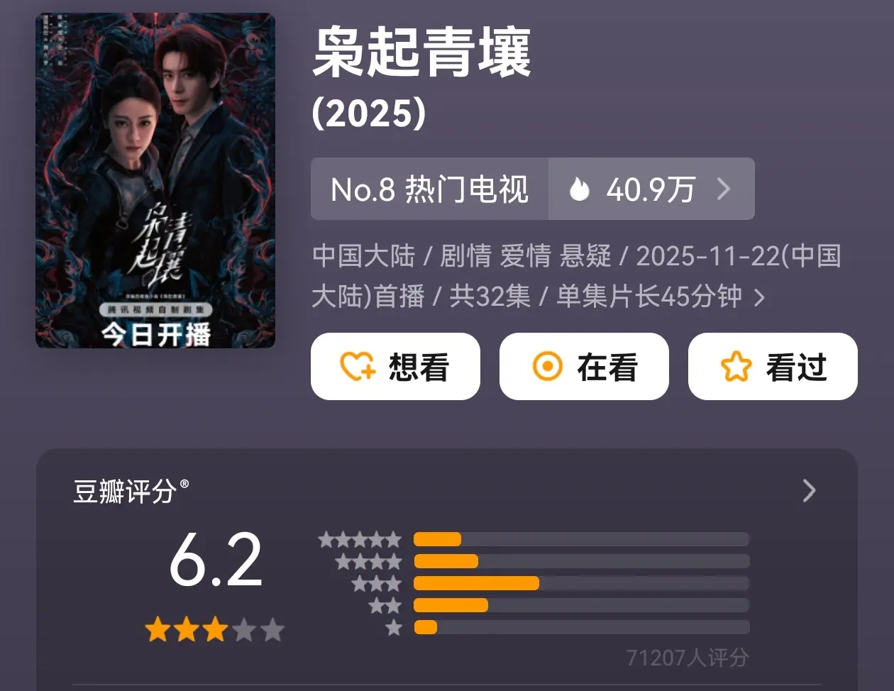 编剧要走寻常路,把大量的镜头给到了爱情,剧情看点少了很多,剧情也就俗了,豆瓣7万人打出来6.2的勉强合格分数。